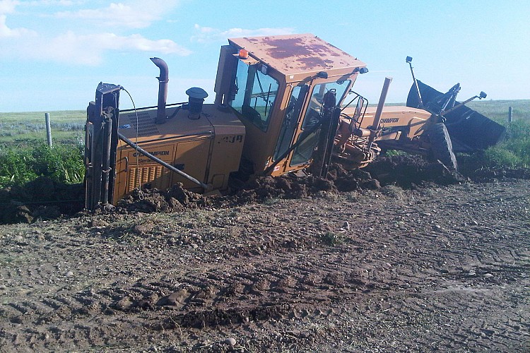 Tried pulling it out with another grader, sunk another foot, tried pulling it out with a JD 4WD Tractor, sunk another foot, after it was about 5 ft deep I called a winch truck to save me.